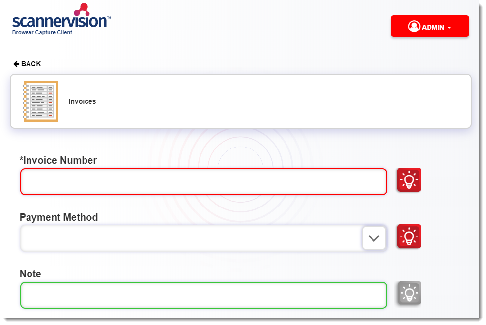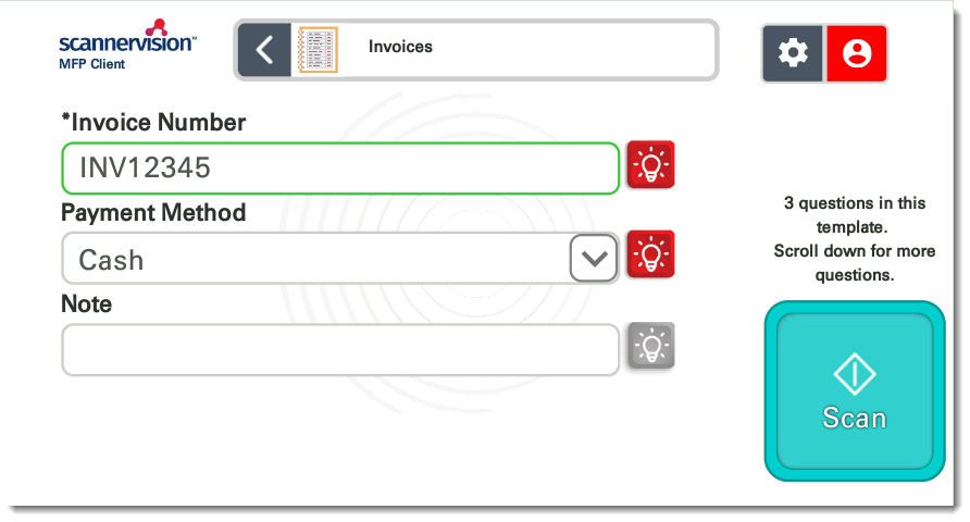 On the templates screen, select the template you want to use for your scan. You may need to answer one or more questions, depending on the configuration of the template. The red line around the box indicates a specific format that must be entered.