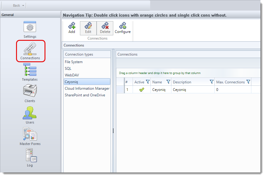 The Connections screen is shown below. The entries in the “Connection types” list is determined by the connectors you have installed.