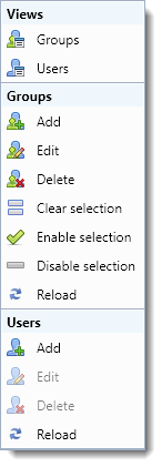 The views section lets you change the view to “Groups” or “Users”. See Managing User.