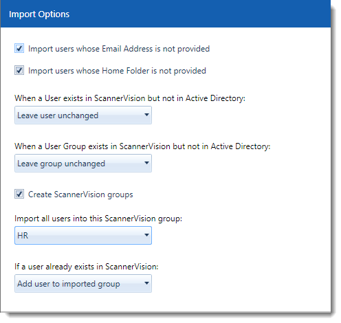 Select this option if you want user groups to be created automatically. If you disable this option and you also do not provide a group under the “Import all users into this ScannerVision group” option, users will be imported in the “Ungrouped” group (unless the group exists already).